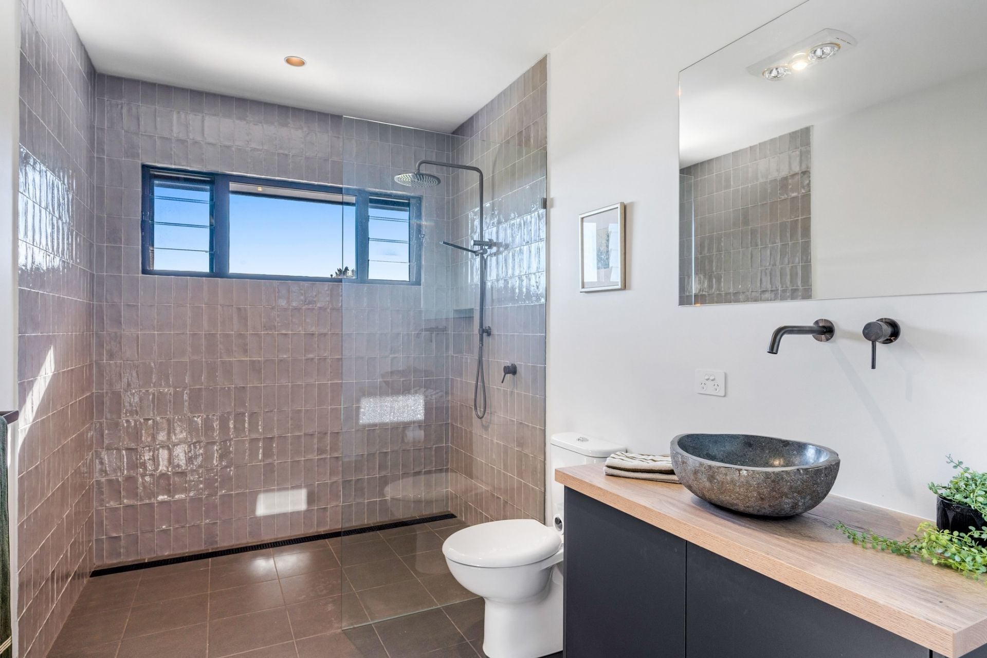 The master suite includes a double vanity ensuite and built-in robes, while two upstairs bedrooms enjoy peaceful outlooks and ocean views. A downstairs bedroom with separate access is ideal for guests or extended family.