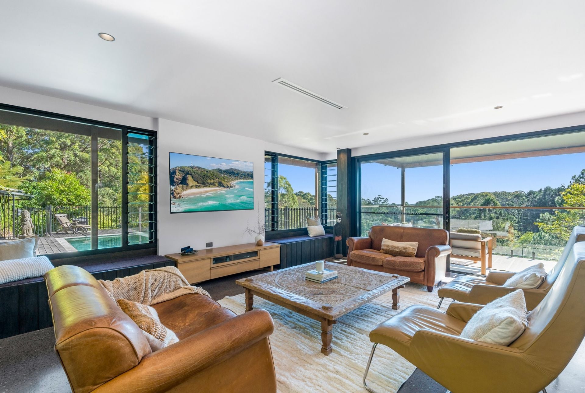 The heart of the home is a spacious open-plan living zone framed by expansive picture windows, showcasing sweeping views across treetops and distant ocean glimpses. Step through sliding doors to a generous north-east facing veranda and poolside entertaining area, where mornings begin with birdsong and evenings unwind beneath the stars.