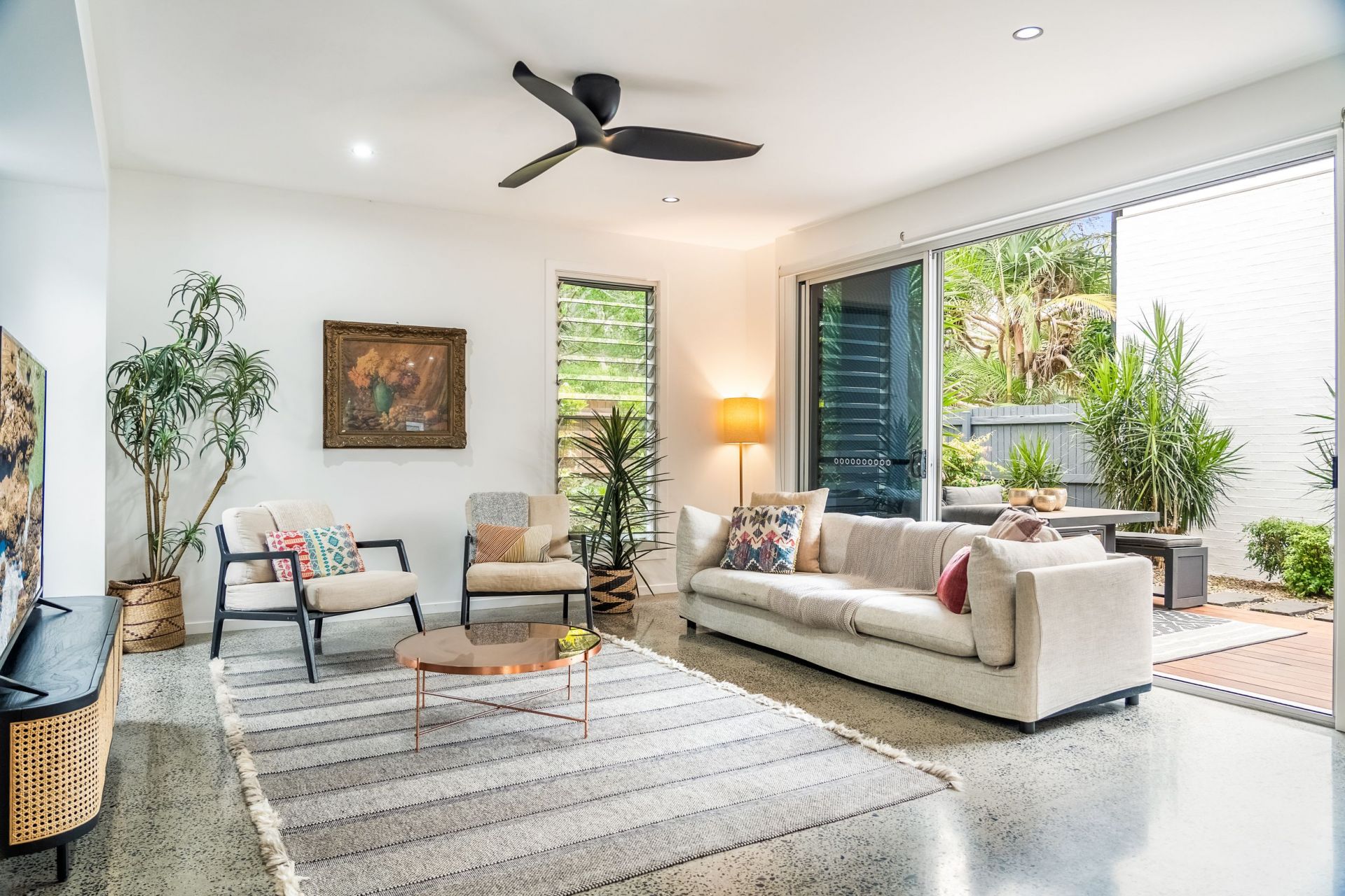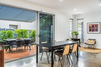 Soaring ceilings and polished concrete floors establish scale and texture throughout, while expansive open-plan living, dining and kitchen areas connect seamlessly to a full-length northern timber deck. The result is effortless indoor–outdoor living, perfectly oriented for year-round entertaining.