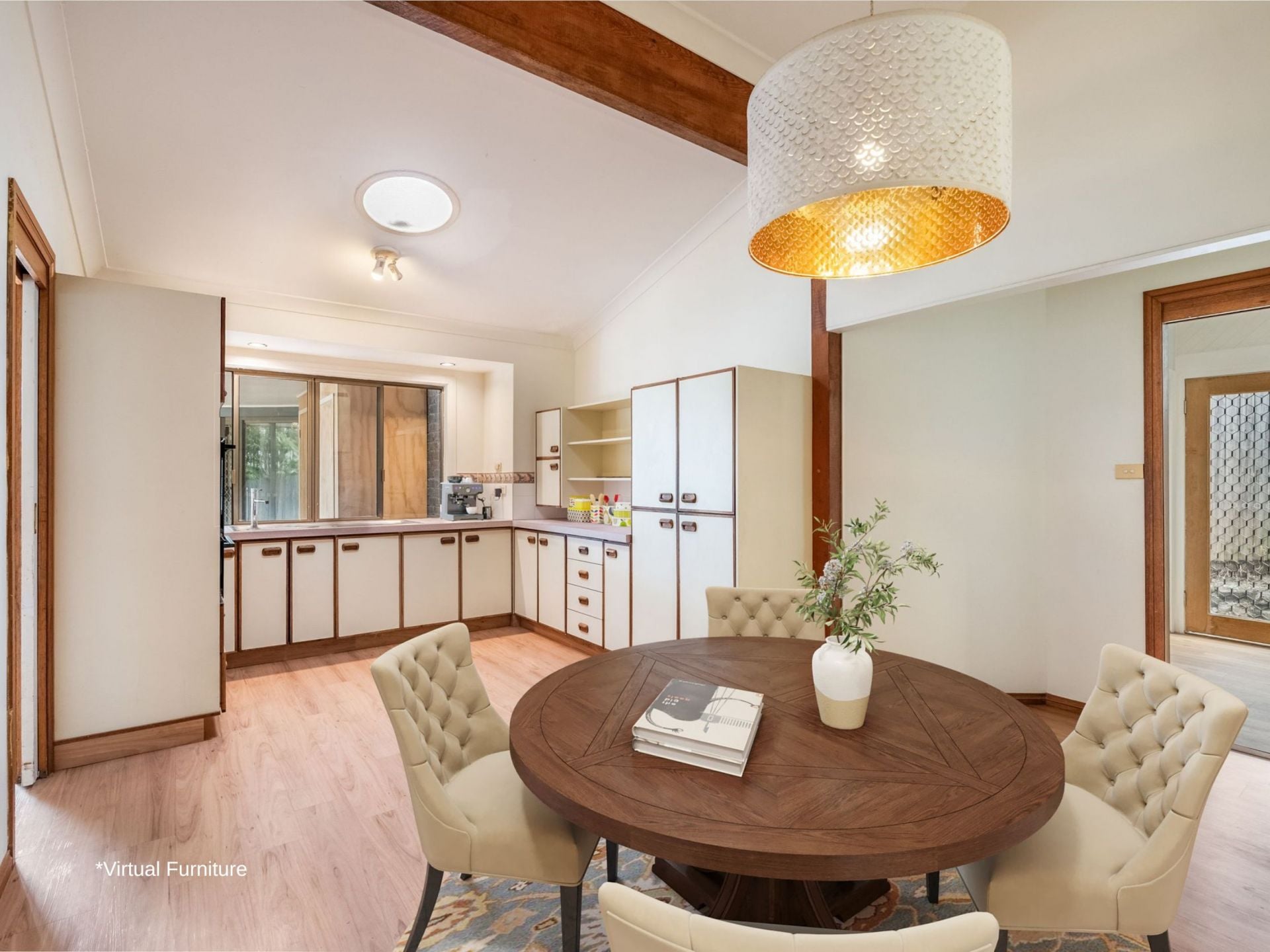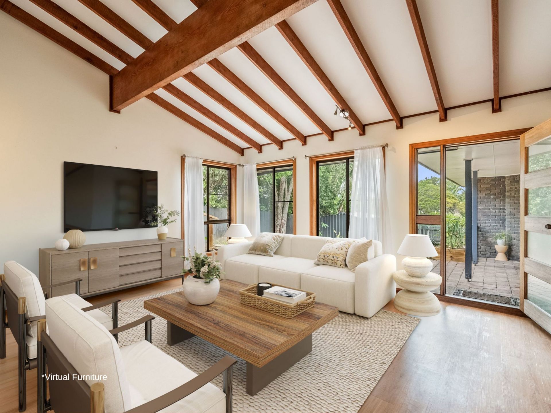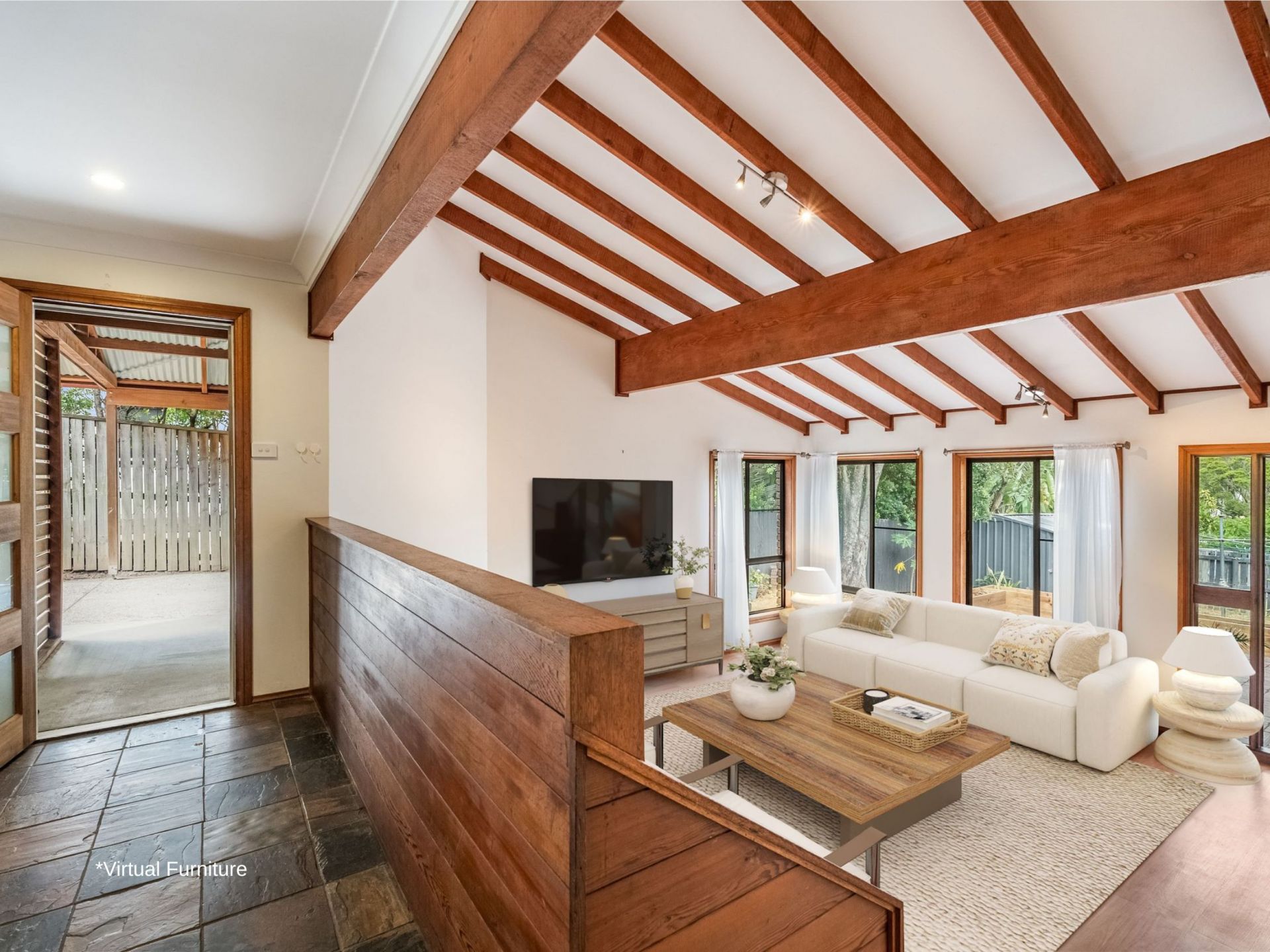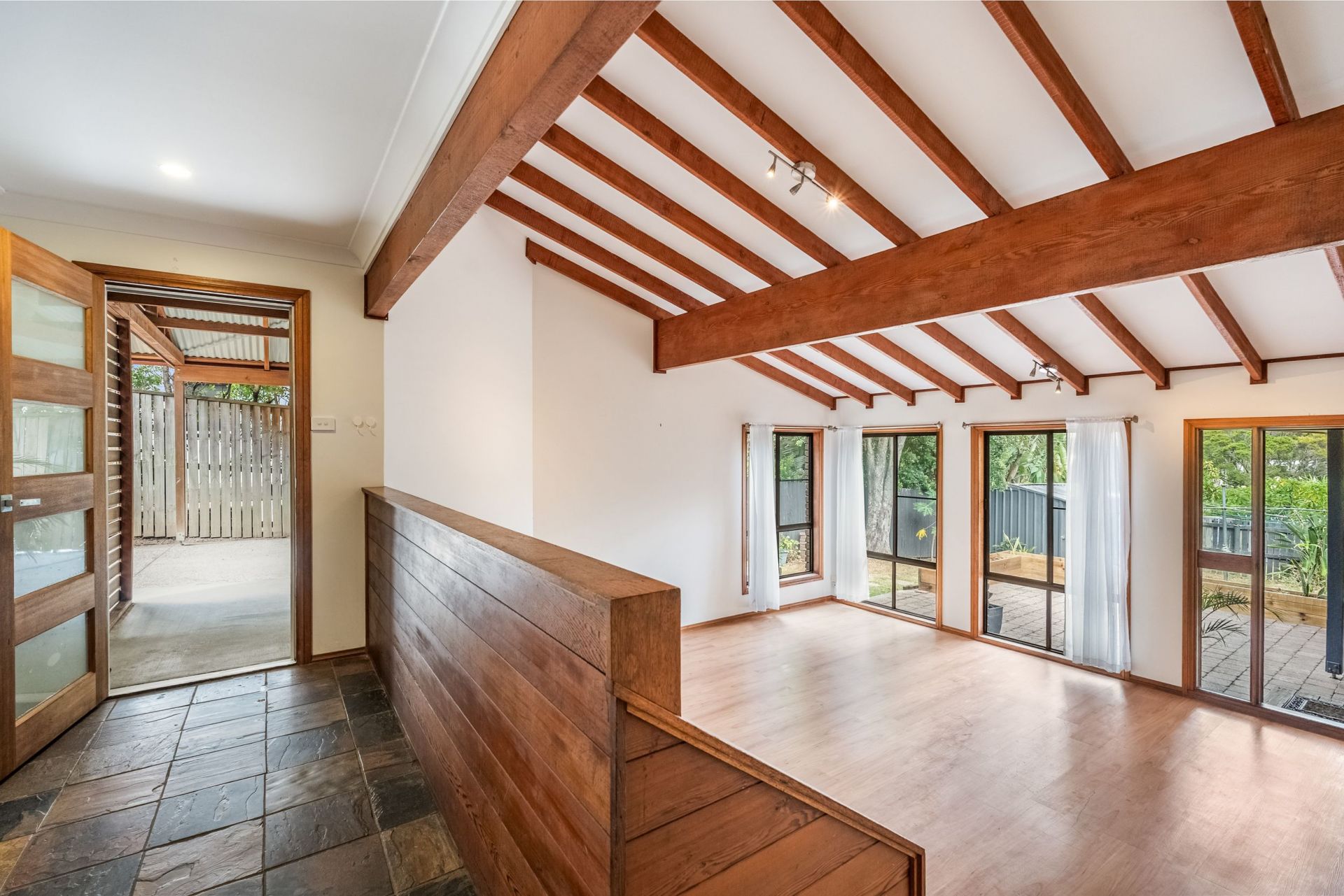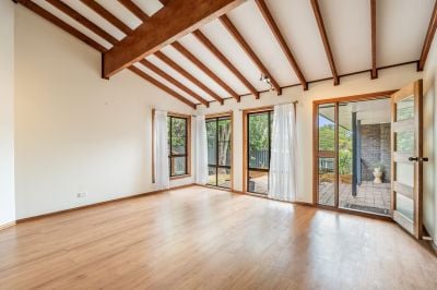 Step into the stunning lounge where soaring ceilings create a grand sense of space, beautifully complemented by large Oregon timber beams and exposed rafters. The natural textures and design details give the home warmth, charm, and a timeless appeal - perfect for both relaxed living and entertaining.