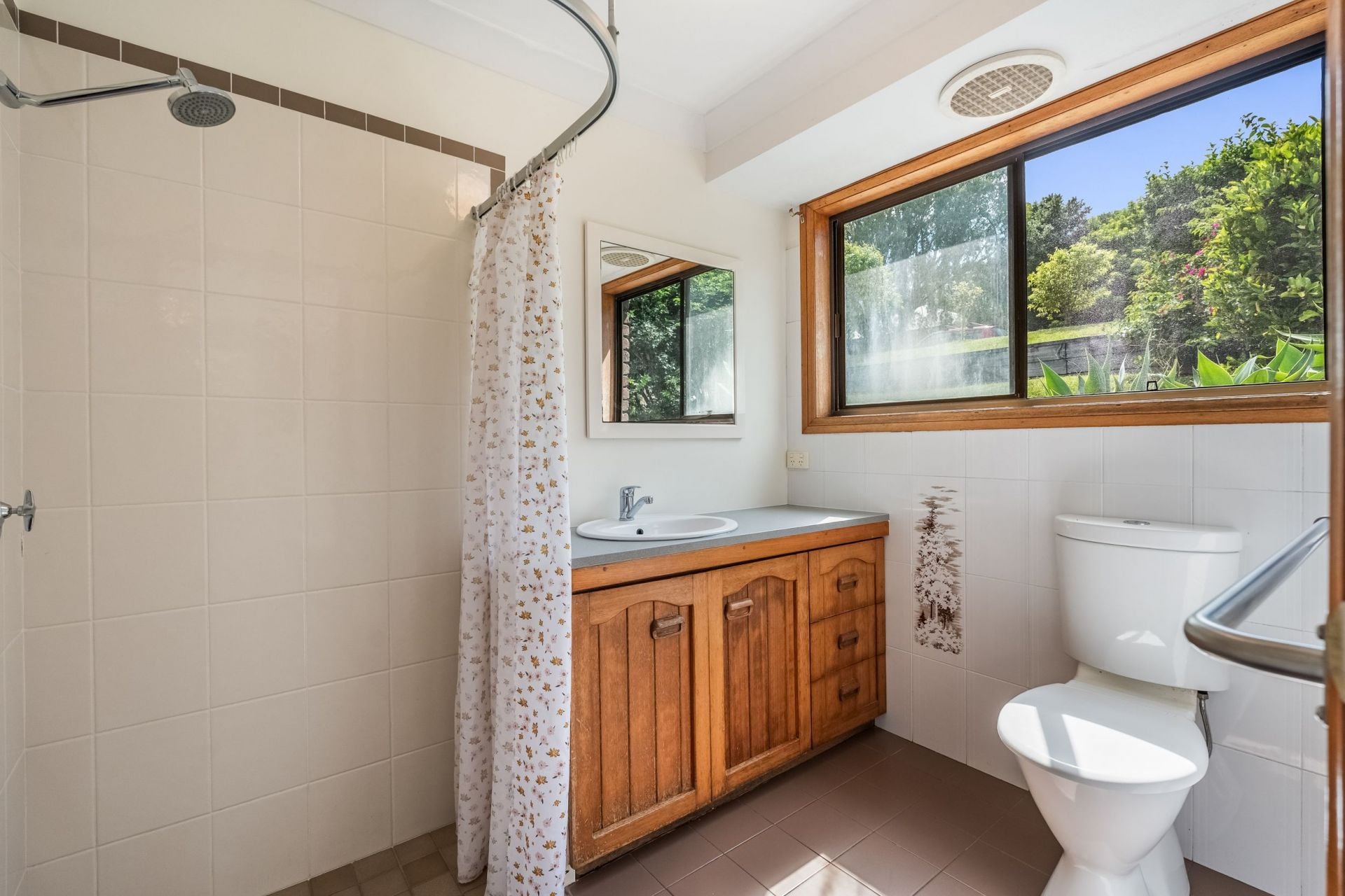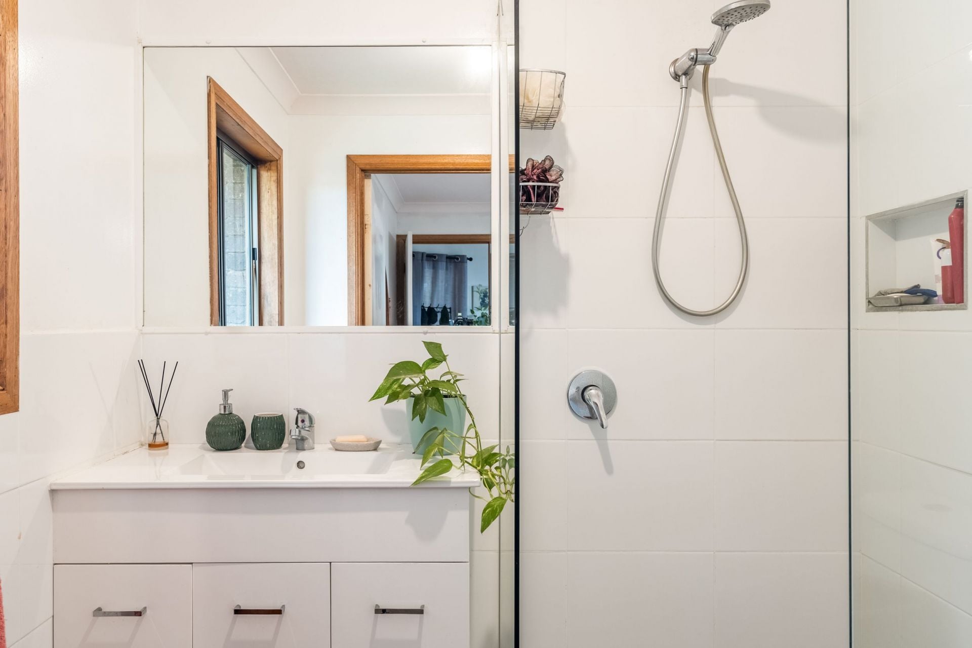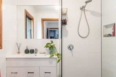 The newly renovated main bathroom showcases sophisticated use of Italian tiles, paired with a striking built-in white timber slat feature. The thoughtful design allows natural light to filter through while maintaining privacy, creating a bright and calming sanctuary.