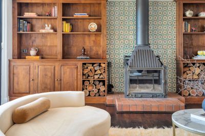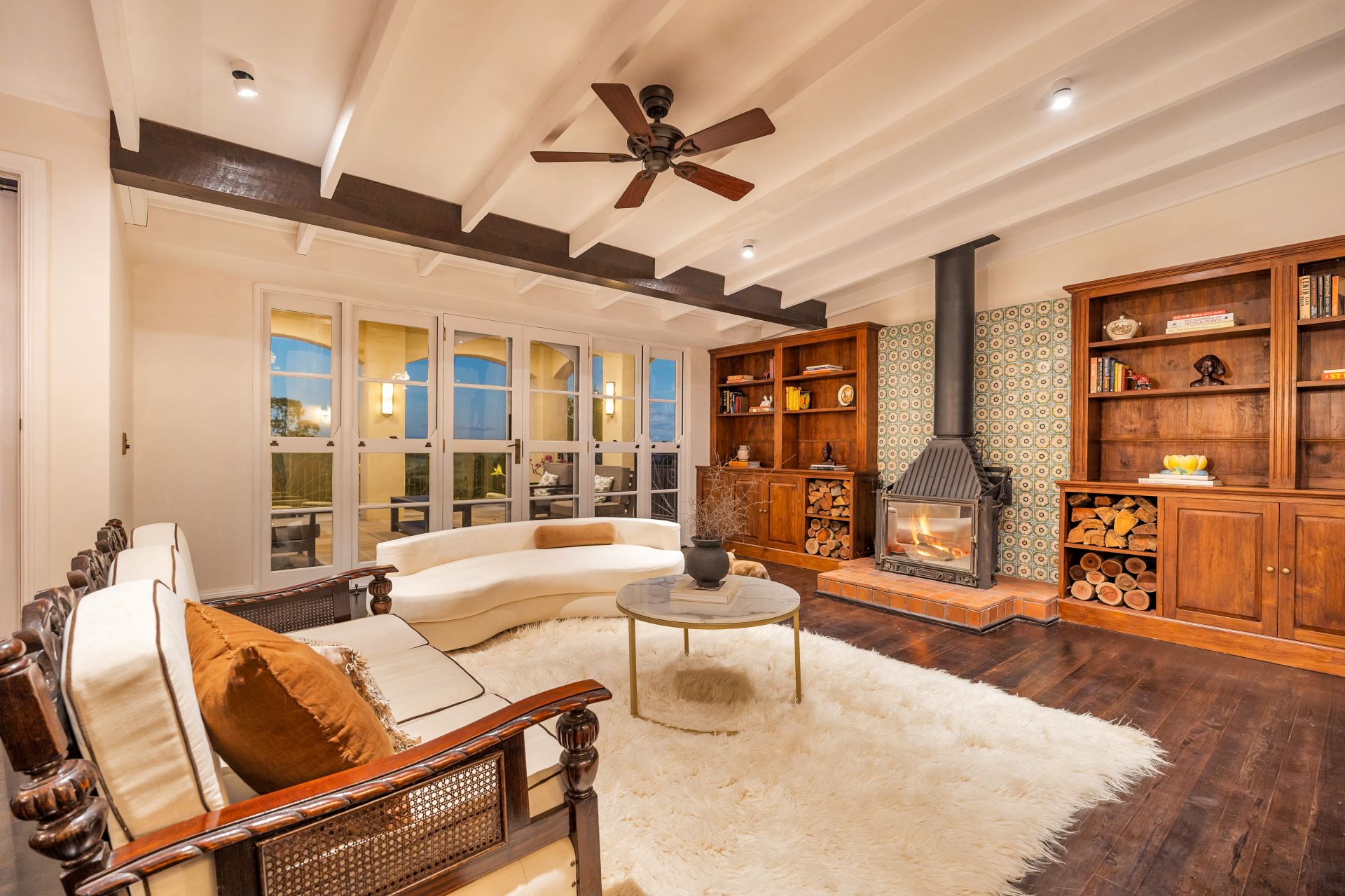At the heart of the residence is a breathtaking, light-filled living area featuring, bespoke cabinetry, and a striking imported Cheminees Philippe French cast iron fireplace-an anchor of intimacy and elegance. This central space flows seamlessly to an expansive loggia, perfect for sophisticated outdoor entertaining or tranquil evenings watching the sun dip behind rolling green hills.