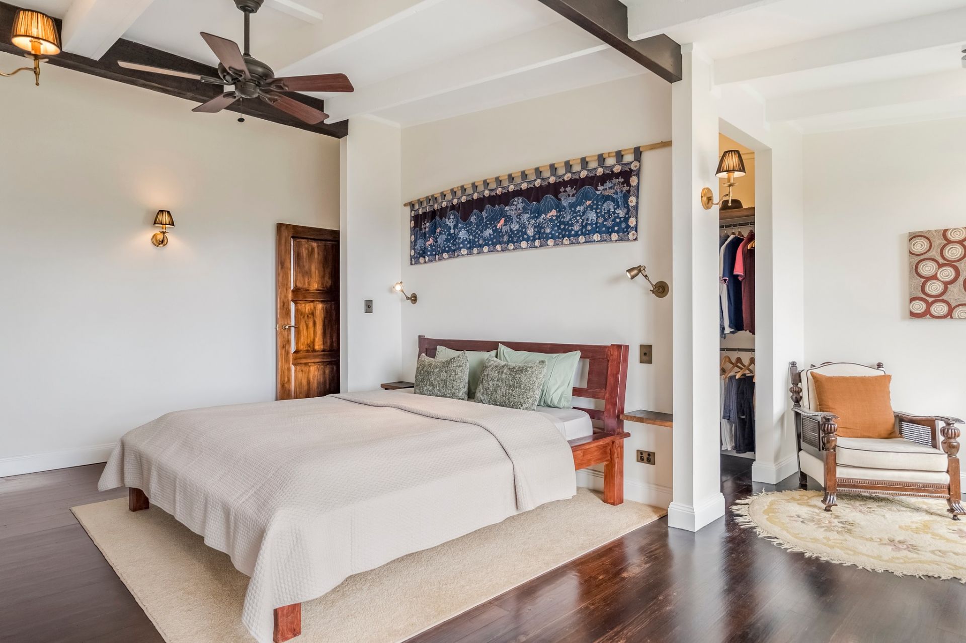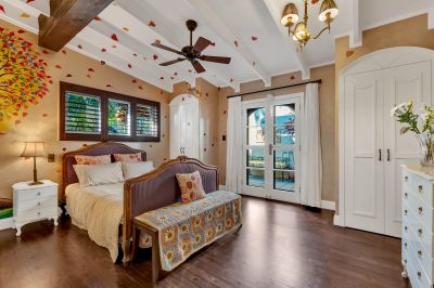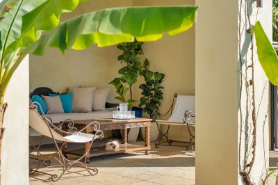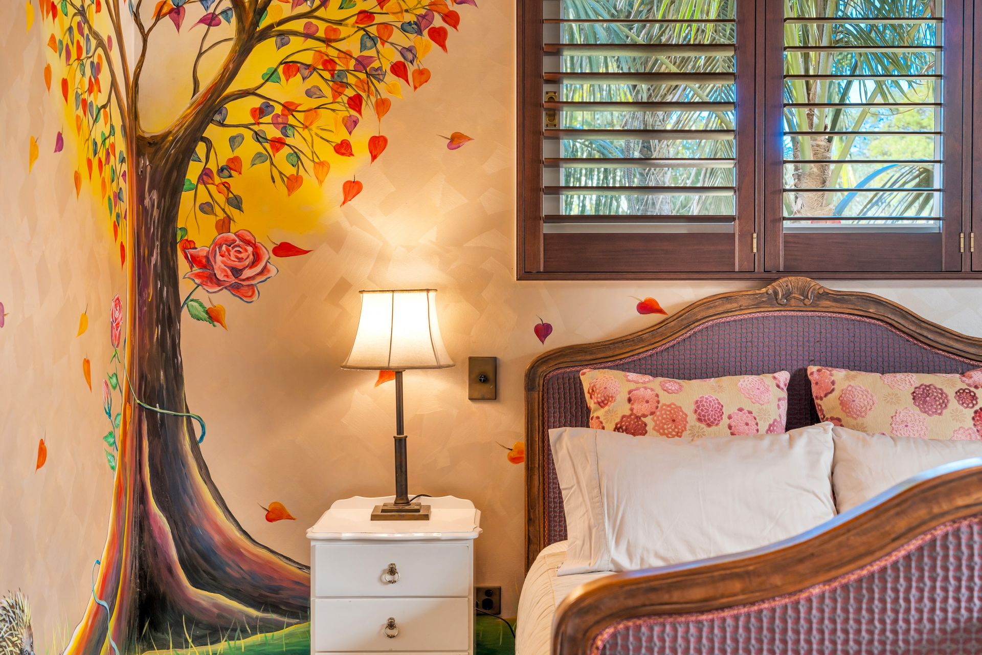 A second master suite offers a serene escape, boasting a private sunlit courtyard and an enchanting hand-painted Tree of Love fresco, adding a romantic flourish. Two additional guest bedrooms open onto a covered arched loggia surrounded by tropical gardens, sharing a luxurious marble bathroom in a secluded wing-perfect for privacy and repose.