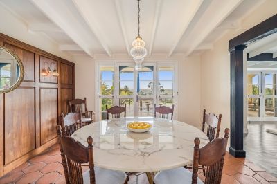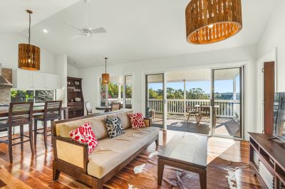 Beyond, a formal dining room extends through French doors to a sun-drenched northern terrace, framing vistas of lush hinterland and glimmering ocean glimpses-evoking the very essence of barefoot luxury.