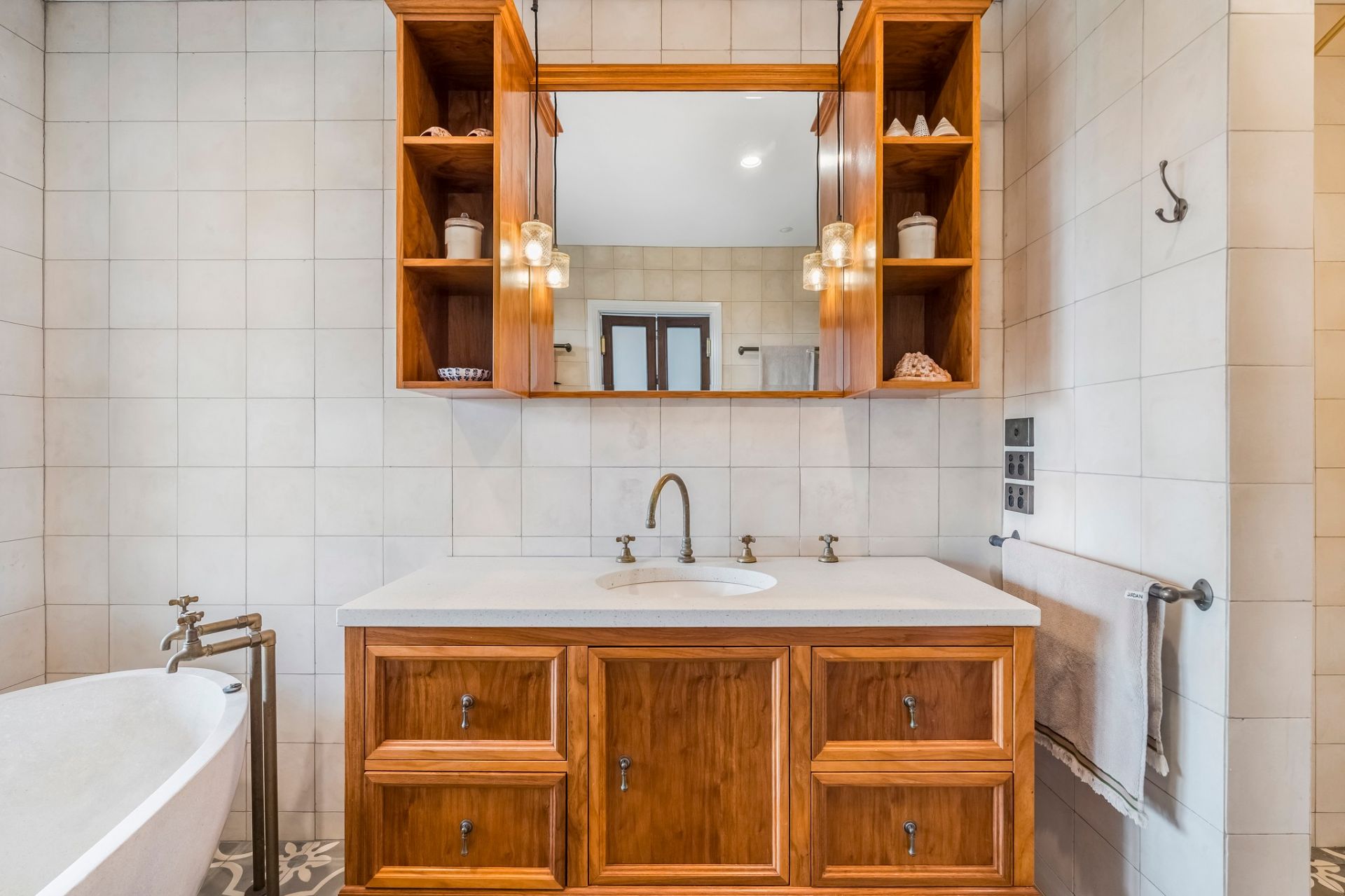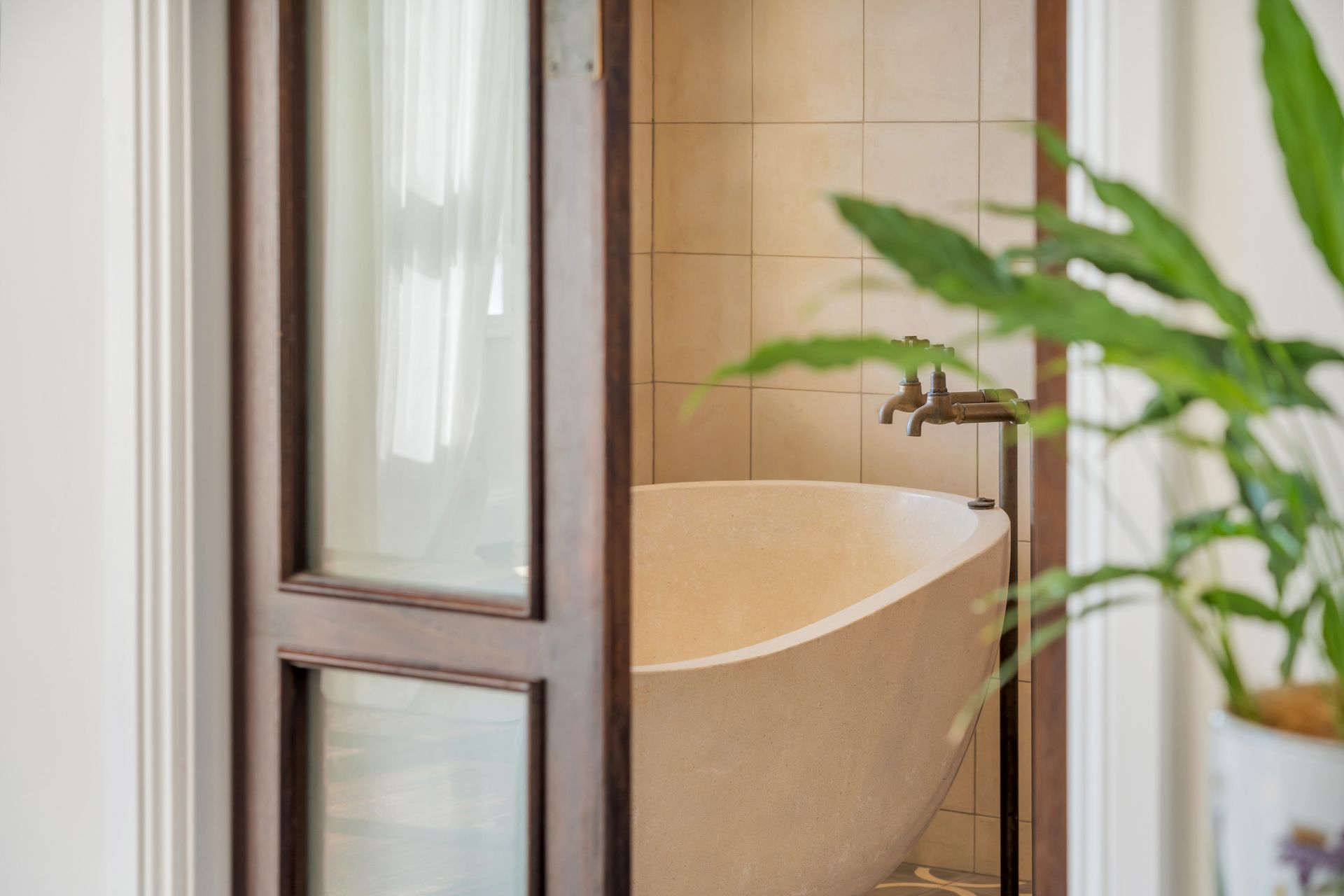 The grand master suite is a personal sanctuary, complete with a sumptuous ensuite featuring a freestanding terrazzo bath, artisanal encaustic tiles, bespoke cabinetry, a private dressing room, and a walk-in robe. French doors open to a secluded northeast-facing balcony, inviting morning light and gentle coastal breezes.