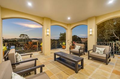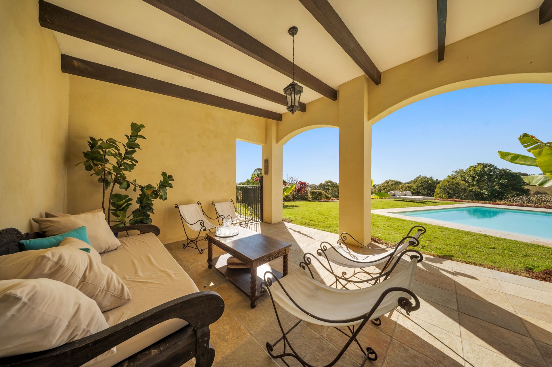 The lifestyle continues beyond the interiors. A vast terrace descends to a private, heated inground pool and elegant poolside cabana with full bathroom, outdoor kitchen, and a sheltered entertaining area framed by graceful Spanish arches, all overlooking the rolling hinterland.