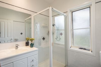 Inside, the home has been thoughtfully designed to bring the outdoors in. High 9-10ft ceilings, boxwood timber floors, and a recently renovated open-plan kitchen and dining area create an immediate sense of warmth and flow. Tasmanian Oak cabinetry paired with 50mm bullnose granite benchtops anchors the kitchen as both a functional and social heart of the home.