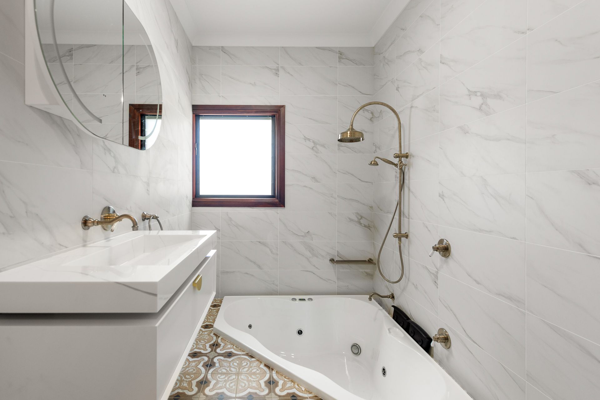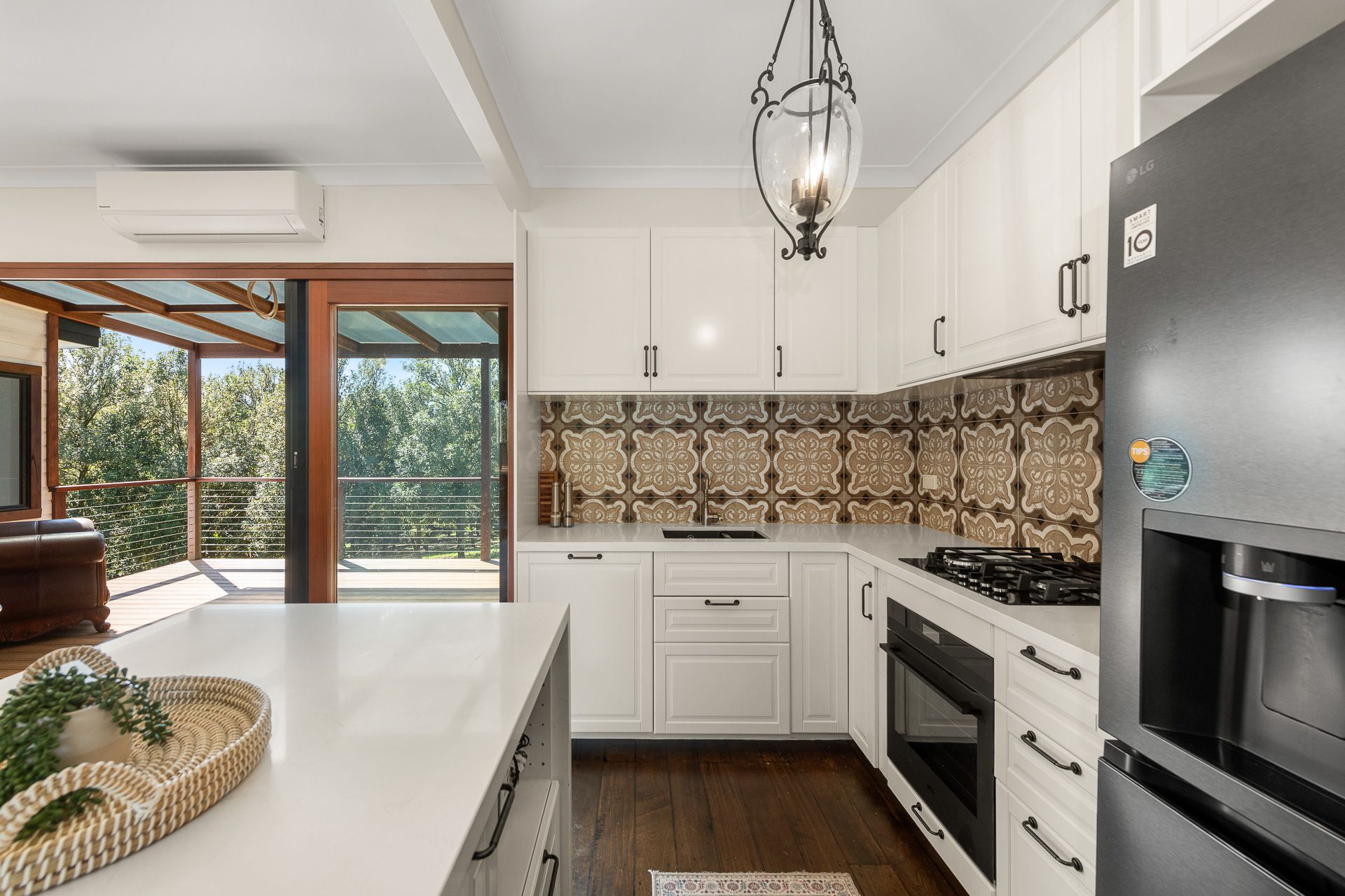 The standout kitchen is finished with elegant Italian tiles, sleek composite stone benchtops, and quality appliances. The modern bathroom features the same distinct Italian tile, ornate chrome tapware and step-in spa bath.