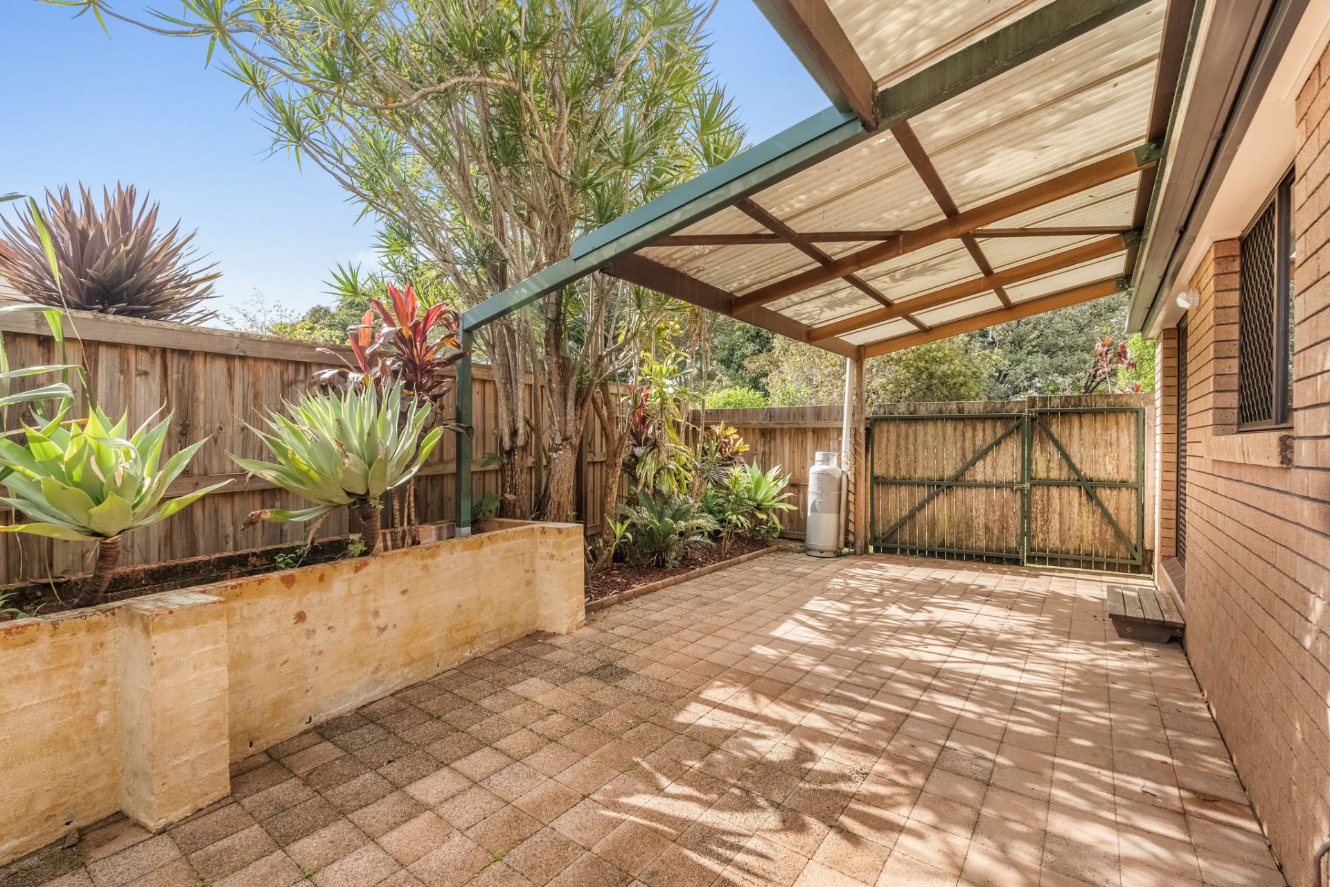 The open plan living and dining areas flow into a sleek, contemporary kitchen featuring a gas cooktop, breakfast bar, and dishwasher. All bedrooms are equipped with ceiling fans for year-round comfort. Step outside to a private, landscaped courtyard complete with a covered entertaining area—perfect for relaxing or hosting guests.