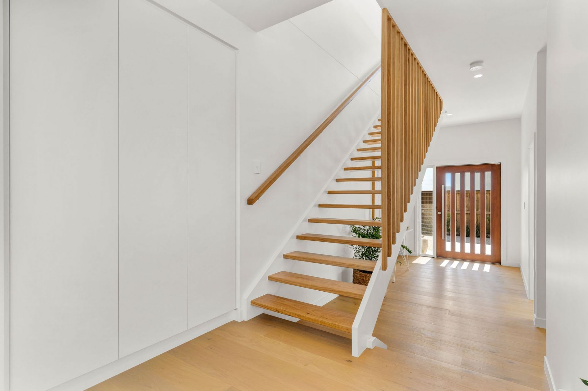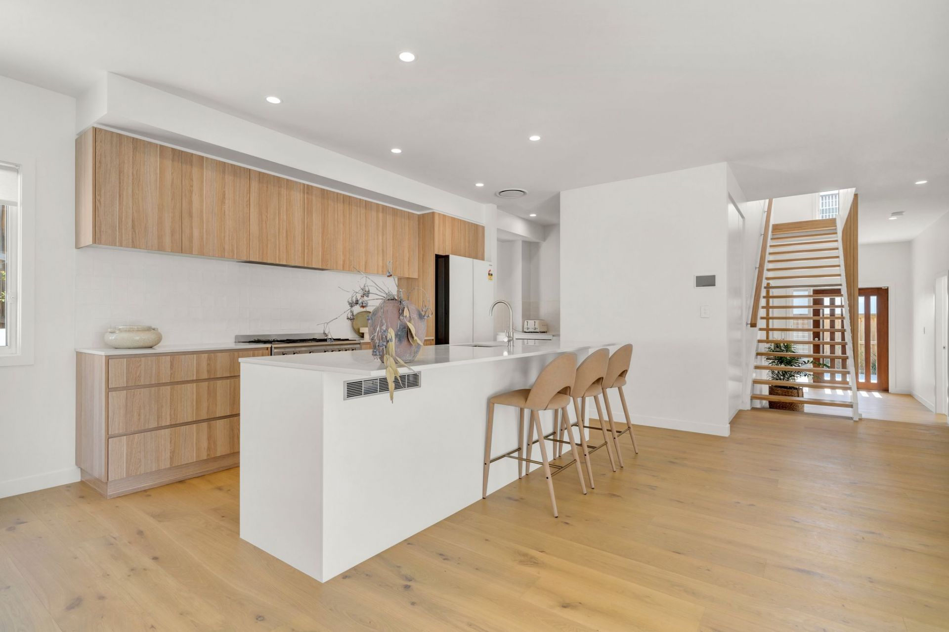 Upstairs, a large second open living zone with a balcony connects to three additional bedrooms, including the master suite with a walk-through robe and ensuite. A well-equipped family bathroom adds convenience.